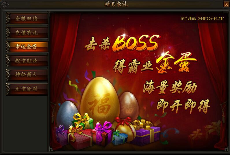 活动期间击杀BOSS有几率掉落金蛋、银蛋、铜蛋,开启可能获得转生丹、经验丹、绑元等奖励。