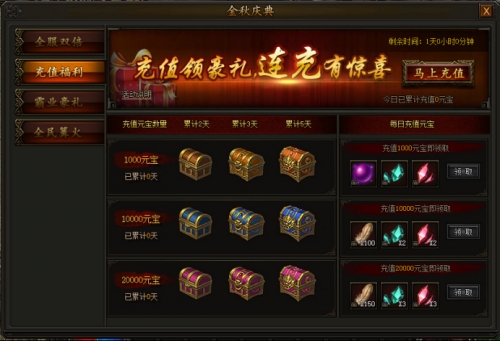 活动期间,充值满一定数量元宝,即可领取每日充值元宝对应档奖励,每档奖励每天均可领取一次,同时累计充值元宝满一定数量且达到要求天数,还可额外领取对应累计天数充值元宝对应档奖励,机会只有一次,不容错过。