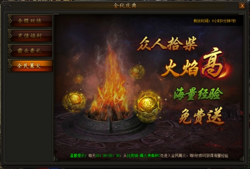 篝火熄灭后,场景内随机刷新篝火守护BOSS,击杀掉落大量元宝、绑定元宝道具,可*拾取。