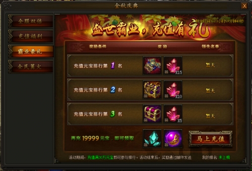 活动期间,累计充值一定元宝即可领取海量奖励。充值元宝数满30w可参与排行,排行前三即可获得对应霸业装备和极品首饰奖励。