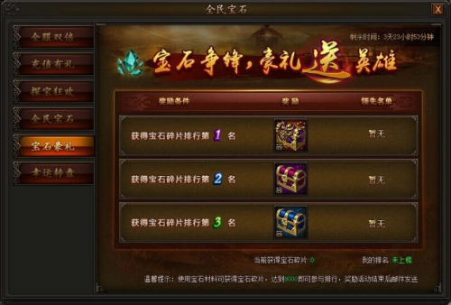 活动期间,使用宝石结晶大、中、小材料获得宝石碎片,获得碎片数目达到8000即可参与碎片获得排行,有机会获得霸业装备、极品首饰奖励!活动结束后,奖励通过邮件发送。