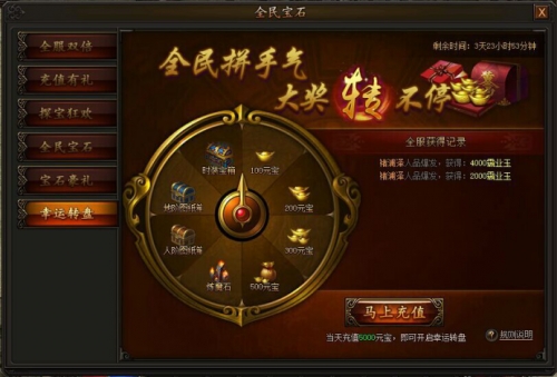 活动期间,充值并消费一定元宝即可使用幸运转盘,获得大量不绑定元宝返还,更有机会得到时装宝箱,获得珍稀时装奖励。
