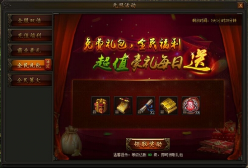 活动期间,80级以上(包含80级)玩家登录即可领取免费奖励,每天均可领取一次。