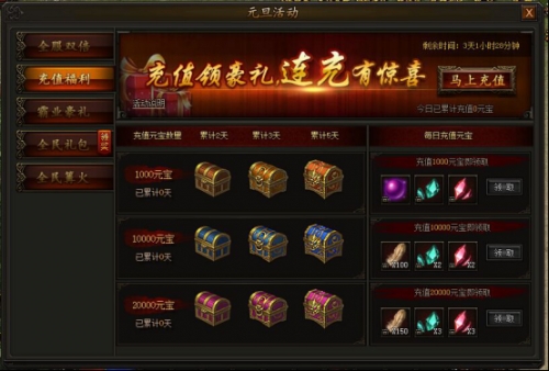 活动期间,充值满一定数量元宝,即可领取每日充值元宝对应档奖励,每档奖励每天均可领取一次,同时累计充值元宝满一定数量且达到要求天数,还可额外领取对应累计天数充值元宝对应档奖励,机会只有一次,不容错过。
