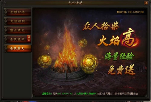 篝火熄灭后,场景内随机刷新篝火守护BOSS,击杀掉落大量元宝、绑定元宝道具,可*拾取。