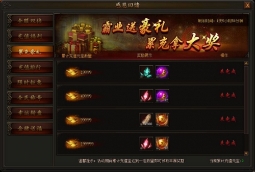 活动期间,累计充值一定元宝即可领取海量奖励,每档奖励每个角色只能领取一次。