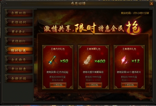 活动第一天和第二天,转生、轮回、宝石礼包限时特卖,第三天至第五天,内功、神翼、魂珠礼包限时特卖,超低折扣仅此五天,感恩限时福利不容错过!