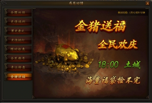 活动期间,每天18:00开始,在土城安全区外,每隔5分钟时间刷新大量金猪boss,共刷新六次,击杀boss可以拾取海量霸业福袋,使用福袋随机获得大量霸业玉和巨额元宝。