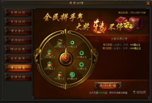 活动期间,充值并消费一定元宝即可使用转盘,获得大量霸业玉返还,可前往霸业商城购买限时称号和海量道具。