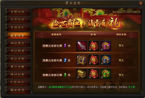 活动期间,累计消费满30w元宝即可参与排行,排行前3名即可获得霸业以及高级转生装备,豪礼不容错过。