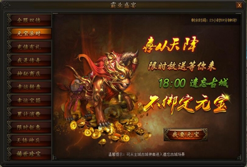 活动期间下午18:00,可通过*古城使者NPC处进入遗忘古城,击杀boss后掉落不绑定元宝,掉落物品无归属。