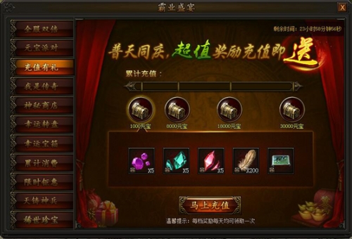 活动期间,充值元宝即可领取四档丰厚奖励,每天均可领取一次,不容错过!
