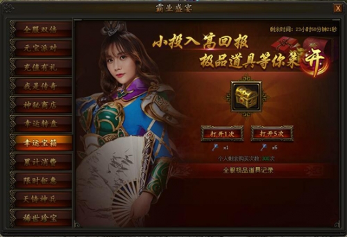 活动期间,80级以上(包含80级)玩家每天最多可购买300次,打开幸运宝箱可随机获得一种道具,多买多得,极品道具等你来开!钥匙可从稀世珍宝中获得。