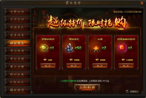 活动期间,每两小时神秘商店会自动刷新一批道具,也可花费元宝立即刷新,大量道具限时等你抢购。