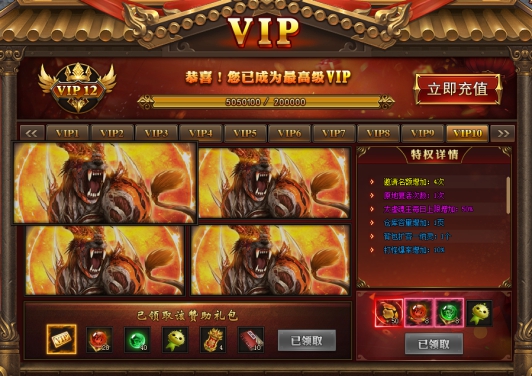 VIP福利,充值1000金币即可成发vip1,充值相应的金额即可获得对应的VIP级数。