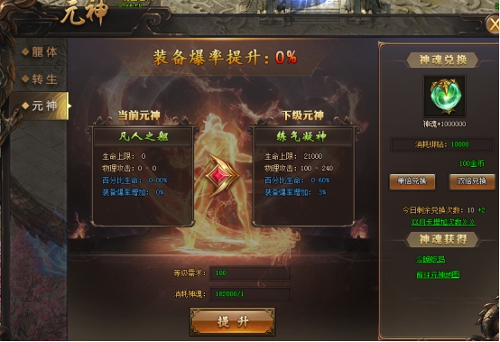 随着元神等级的提升,会使人物在游戏中获得更多保障,提升元神可以使物理攻击、魔法攻击、道术攻击、生命上限、物理防御和魔法防御装备爆率达到极限