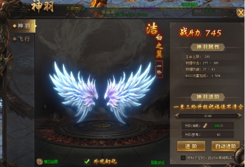 拥有一双闪耀的翅膀绝对是华丽与霸气的结合,实力与身份的象征!翅膀设计采用的是西方神话中天使、恶魔和精灵双翼的造型,英雄豪杰如果配备上这样的翅膀出现在沙城之中,绝对引来艳羡无数!翅膀升阶可以通过材料副本任务获得羽毛,也可以通过金币购买来获得羽毛进行进阶羽毛等级。